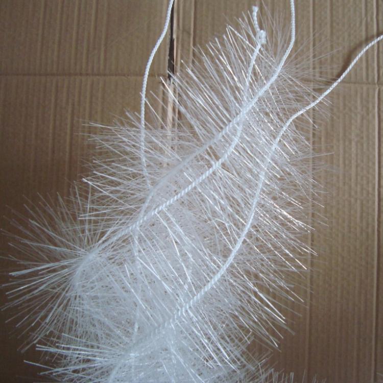彈性填料篩選用聚烯烴類和聚酰胺中的幾種耐腐、耐溫、耐老化的品種,混合以親水、吸附、抗熱氧等助劑,采用特殊的拉絲、絲條制毛工藝,將絲條穿插同著在耐腐、高強(qiáng)度的中心繩上。由于選材和工藝配方精良,剛?cè)徇m度,使絲條呈立體均勻排列輻射狀態(tài),制成了懸掛式立體彈性填料的單體.填料在有效區(qū)域內(nèi)能立體全方位均勻舒展?jié)M布,使氣、水、生物膜得到充分混滲接觸交換,生物膜不僅能均勻地著床在每一根絲條上,保持良好的活性和空隙可變性,而且能在運(yùn)行過(guò)程中獲得大的比表面積。